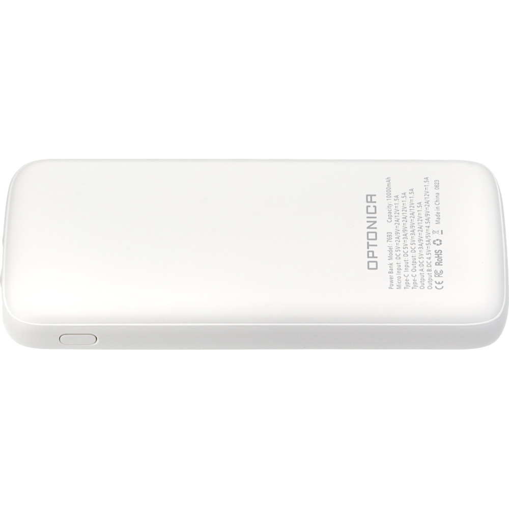 Optonica hordozható külső akkumulátor, 10000 mAh (nominális feszültség 3,7 V, kb. 37 Wh), fehér kivitel. Kettős csatlakozási lehetőség: Micro-USB és USB-C bemenetek a töltéshez, USB-A/USB-C kimenetek az eszközök töltéséhez (mikro/C típus támogatott). Maximális kimeneti teljesítmény 22,5 W, gyorstöltésre alkalmas, így gyorsan feltölti az okostelefonokat, fülhallgatókat és egyéb hordozható eszközöket. Kompakt, könnyű kialakítás, ideális utazáshoz és mindennapi használatra; átlagos okostelefon többszöri töltésére elegendő kapacitás. Beépített töltöttségjelző LED, be-/kikapcsoló és intelligens áramköri vezérlés a rövidzárlat, túláram, túltöltés és túlmelegedés elleni védelem érdekében. Masszív, égésgátló ABS/PC burkolat, egyszerű kezelhetőség és széleskörű kompatibilitás Android és iOS eszközökkel. Használat előtt ajánlott a mellékelt vagy minőségi adatkábel alkalmazása; tárolás és töltés száraz, jól szellőző helyen, emelkedett hőmérséklettől és víztől védve.