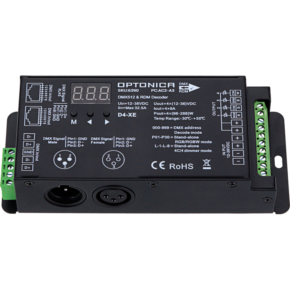 Az Optonica 4 csatornás állandó feszültségű DMX512 dekóder professzionális vezérlési megoldást kínál LED világítások és színkeverő rendszerek számára. Négy független kimenetén finom PWM-dimmelést és pontos színkeverést tesz lehetővé állandó feszültségű LED szalagok és modulok vezérléséhez. Teljes DMX512 kompatibilitás, egyszerűen beállítható DMX-címzés és megbízható kommunikáció a világítási rendszerekkel. Kompakt, masszív kivitel, könnyű bekötés csatlakozókkal; a készülék beépített védelemmel rendelkezik túlterhelés, rövidzárlat és túlmelegedés ellen, növelve az üzembiztonságot. Ideális színházi, rendezvény-, kereskedelmi és lakossági dekorációs alkalmazásokhoz, ahol többcsatornás, precíz vezérlésre van szükség, és sima, villogásmentes fényátmeneteket igényelnek.