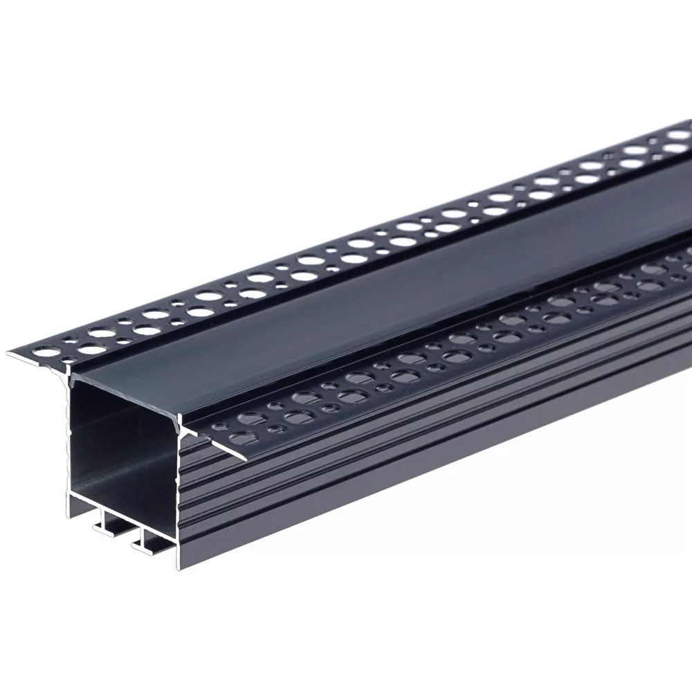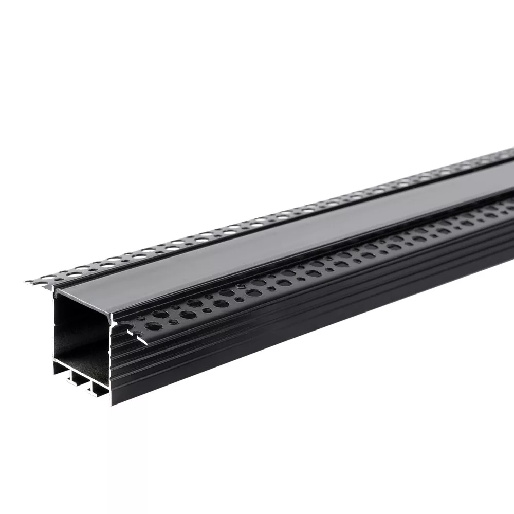 Prémium alumínium profil LED szalagok beépítéséhez, modern fekete kialakítással és fekete takarófedelettel. Külső méretei 71,5 x 35 mm, robusztus, extrudált alumíniumból készült, amely hatékony hőelvonást biztosít a LED szalag számára, ezáltal növelve annak élettartamát és stabilitását. A takarólap egyenletes fénydiffúziót nyújt, csökkenti a szalag pixeles megjelenését és diszkrét, esztétikus megjelenést eredményez.