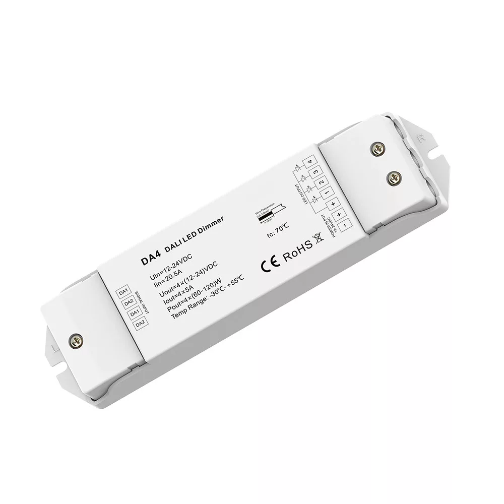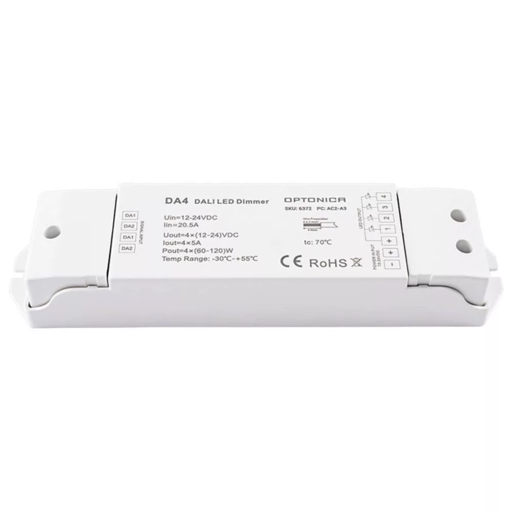 Az Optonica DALI LED dimmer egy professzionális, DALI protokollal kompatibilis megoldás modern LED világítás vezérléséhez. Esztétikus fehér kivitelével illeszkedik a legtöbb belső térhez, míg kompakt és falba szerelhető kivitele egyszerű telepítést tesz lehetővé. A készülék sima, villogásmentes fényerőszabályozást biztosít, lehetővé téve a finom fényerő-állítást és a megbízható működést különböző LED meghajtókkal és lámpákkal. Támogatja a DALI vezérlőbusz előnyeit, így integrálható automatizált világítási rendszerekbe, többzónás vezérlésre és jelenet-meghatározásra is. Robusztus kialakítása és beépített védelmi funkciói (pl. túlterhelés- és rövidzárlat-védelem) növelik a biztonságot és az élettartamot. Ideális választás otthoni, irodai vagy kereskedelmi alkalmazásokhoz, ahol precíz, központi vezérlésű LED dimmelésre van szükség.