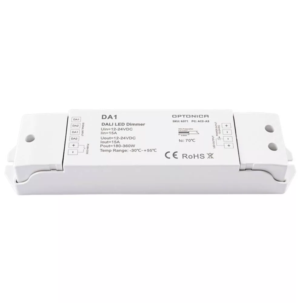 Optonica DALI LED dimmer da1 — professzionális, fehér, egycsatornás fényerőszabályzó, amely DALI kommunikáción keresztül vezérli LED terheléseket akár 15 A-ig. Kiválóan alkalmas önálló lámpatestek és LED meghajtók precíz, villogásmentes dimmelésére professzionális és kereskedelmi világítási rendszerekben.