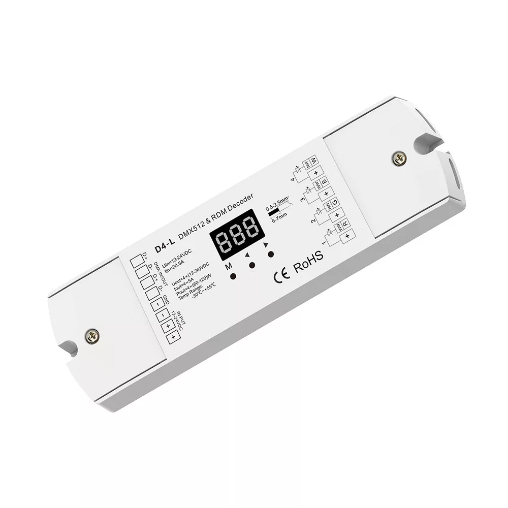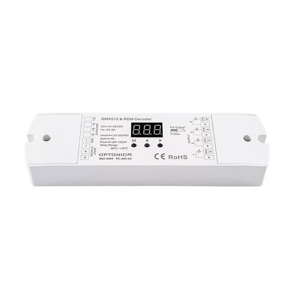 Optonica márkájú DMX512 dekóder fehér kivitelben, professzionális világításvezérléshez tervezve. A készülék átalakítja a DMX512 jelből érkező parancsokat PWM/analóg kimenetekre, így LED-szalagok, RGB/RGBW lámpatestek és egyéb fényforrások pontos vezérlését teszi lehetővé. Kompatibilis szabványos DMX vezérlőrendszerekkel, rugalmas címzési lehetőségeket és többcsatornás kimeneteket biztosít a komplex fényjelenetek kialakításához. Esztétikus, fehér burkolata diszkrét megjelenést biztosít beltéri installációknál, könnyen szerelhető kialakítása pedig egyszerűsített telepítést eredményez. A dekóder ideális választás színházi világítási rendszerekhez, épületfényekhez, kereskedelmi és lakossági dekorációs installációkhoz. A biztonságos és megbízható működés érdekében javasolt megfelelő feszültségű tápegység és DMX kábelezés használata, valamint a gyártói telepítési útmutató követése.