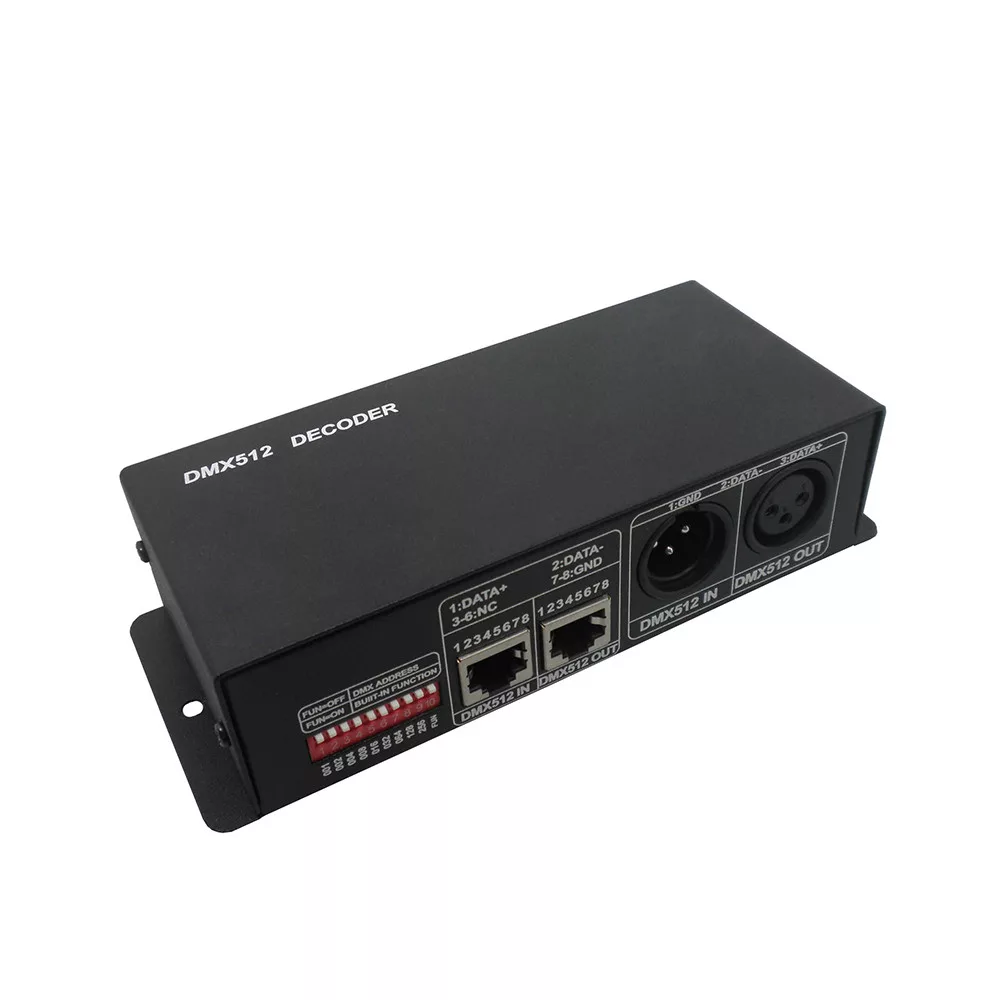 Optonica DMX512 dekóder 12 A kimenettel és 144 W maximális teljesítménnyel, fekete kivitelben. A készülék DMX512 protokollt alakít át vezérelhető PWM kimenetté, így ideális megoldás egy- vagy többszínű LED-szalagok és egyéb dimmelhető világítási egységek precíz fényerőszabályozására. Stabil, sima dimmelést biztosít finom átmenetekkel, pontos címzésre és rendszerszintű vezérlésre optimalizálva. Kompakt kialakításának és szabványos csatlakozóinak köszönhetően egyszerűen integrálható színpadtechnikai, épületvilágítási vagy kereskedelmi installációkba. Üzemeltetéséhez megfelelő DC tápegység és DMX vezérlő szükséges; fontos, hogy a csatlakoztatott terhelés ne haladja meg a 12 A vagy 144 W értéket. Műszaki jellemzők röviden: DMX512 kompatibilis vezérlés, 12 A kimeneti áram, 144 W maximális teljesítmény (megfelelő tápegység mellett), dimmelhető PWM kimenet, fekete burkolat, egyszerű telepítés és címzés.
