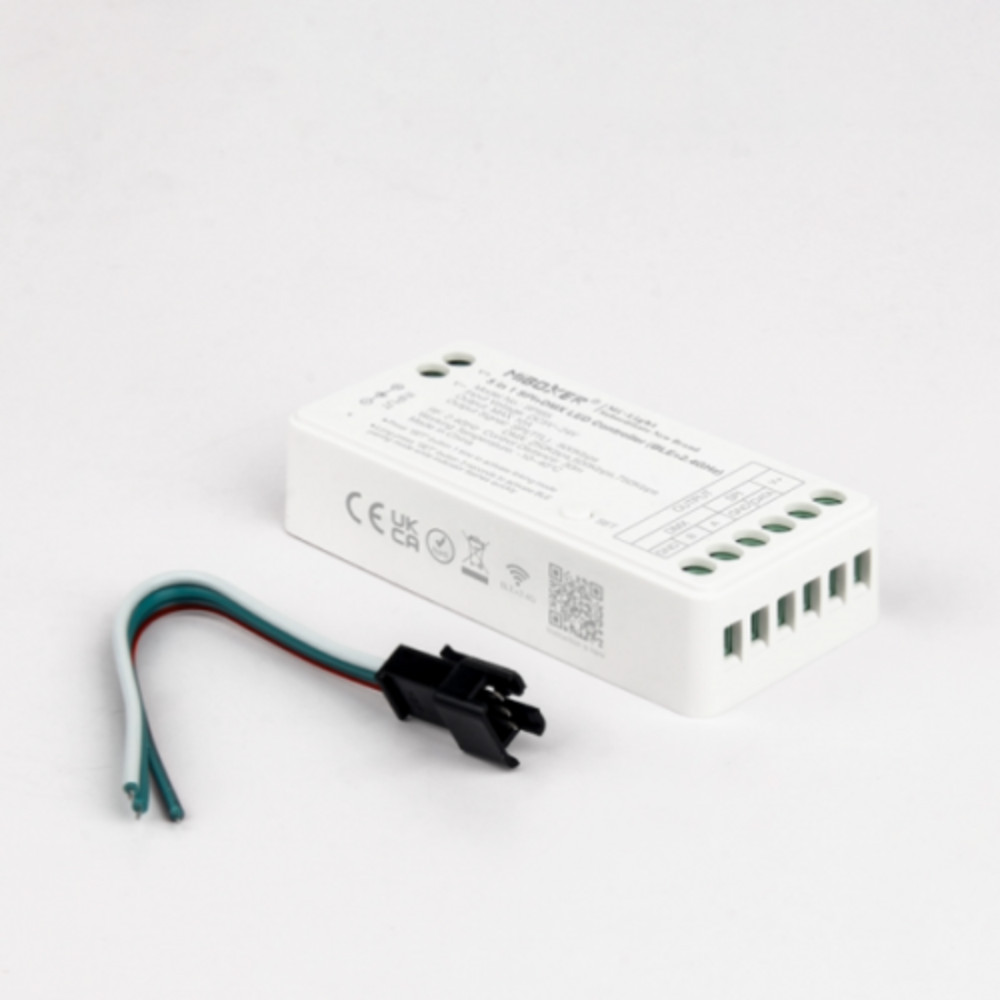 Miboxer SPIB5 – 5 az 1-ben digitális (SPI+DMX) LED szalag vezérlő Bluetooth + 2.4 GHz vezérléssel futófényhez A SPIB5 egy intelligens, nagy tudású LED szalag vezérlő, amely a legkülönfélébb világítási igényekhez igazodik. Képes kezelni monokróm, CCT (állítható fehér színhőmérsékletű), RGB, RGBW, valamint RGB+CCT típusú digitális LED szalagokat is, így valóban univerzális megoldást kínál.A vezérlő kétféle vezeték nélküli kommunikációt alkalmaz: a 2.4 GHz-es rádiófrekvenciás technológiát, amely kompatibilis a Miboxer kézi távirányítóival (pl. C9, B9), valamint a Bluetooth Low Energy (BLE) kapcsolaton keresztüli vezérlést, mely lehetővé teszi a közvetlen irányítást okostelefonról Miboxer mobilalkalmazással – internetes kapcsolat nélkül is.