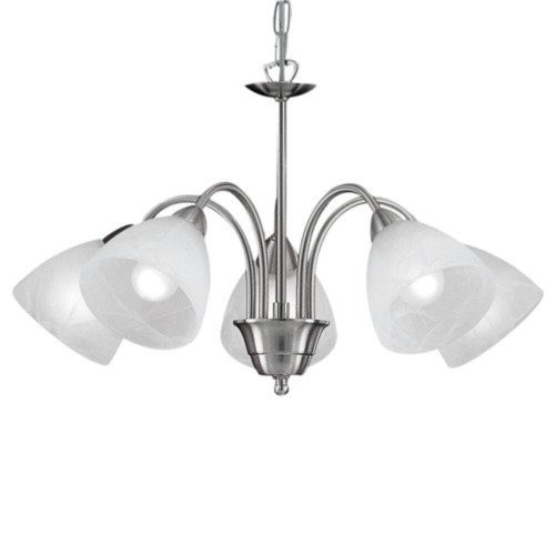 A PASTO függeszték öt kerek lámpaburával rendelkezik, melyek fehér alabástrom üvegből készültek, és ívelt fémkarra vannak felfüggesztve. A burák és a matt nikkel lánc klasszikus megjelenést kölcsönöznek a lámpának. A lámpa jól illeszkedik a vidéki stílusú belső terekbe, barátságos világítást biztosítva a nappaliban vagy az étkezőasztal felett. A képen látható tejfehér izzók nem tartozéka a terméknek. A lámpa E14 foglalattal rendelkezik és E14 izzókat igényel.
