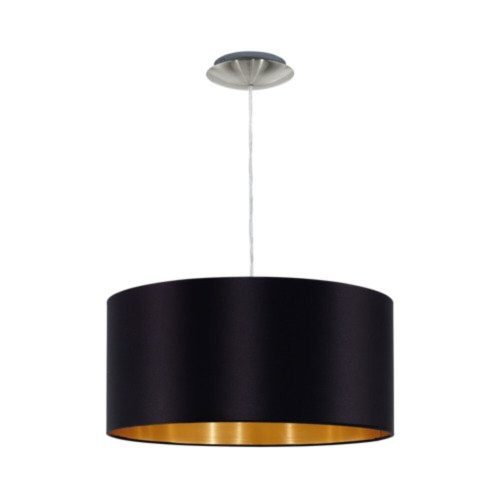 Ez a MASERLO sorozatú függesztő lámpa szatén nikkel acélból és fekete és arany színű szövetből készült. Védőszigeteléssel rendelkezik és E27-es izzóra van szüksége a fényléshez.