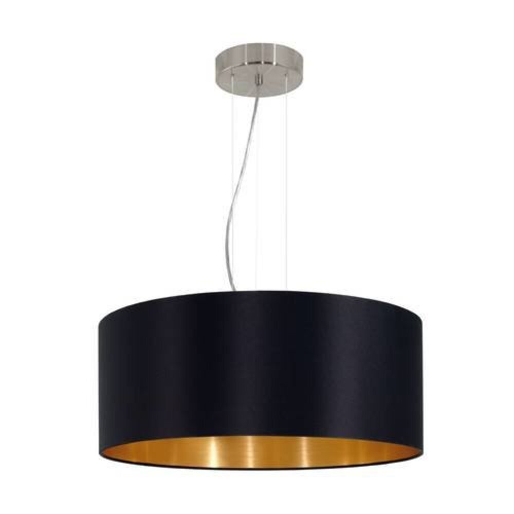 Ez a MASERLO sorozatú függesztett lámpa szatén nikkellel bevont acélból és arany és fekete színű szövetből készül. Védőszigeteléssel rendelkezik és három E27-es izzóra van szüksége a világításhoz.