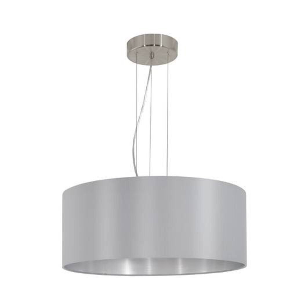 Ez a függesztett lámpa a MASERLO sorozatból készült, szatén nikkellel bevont acélból és szürke és ezüst színű anyagból. Védőszigeteléssel rendelkezik és három E27-es izzóra van szüksége a világításhoz.