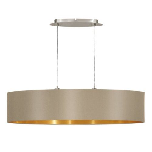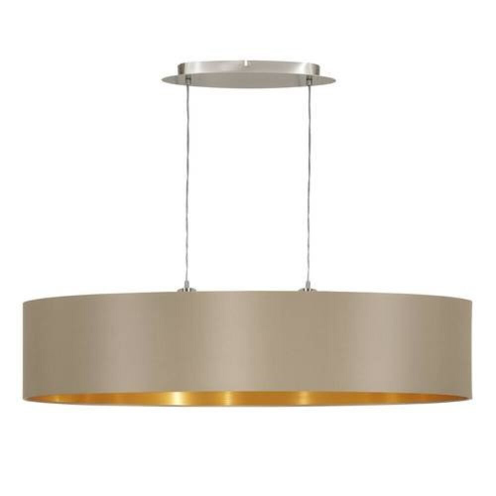 Ez a MASERLO sorozatból származó függő lámpa szatén nikkel acélból és taupe és arany színű szövetből készült. Védőszigeteléssel rendelkezik és két E27-es izzóra van szüksége a fényléshez.