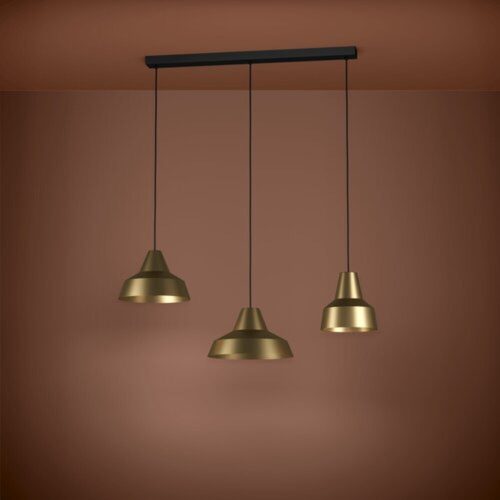 A SAVARNA függeszték lámpa egy modern ipari stílusú világítótest, amely három különböző formájú fémbúrával rendelkezik, arany színű fényezéssel. A lámpák eltérő magasságban függnek egy hosszúkás fekete fém mennyezeti sapkáról, textil kábeleken. Ez a lámpa kiválóan illeszkedik szinte bármilyen belső térhez, vonzó világítást biztosítva akár a nappaliban, akár egy hosszú étkező asztal fölött. A termékhez E27-es foglalatok tartoznak, de a fényforrás nem tartozék. A maximális teljesítmény 3x40W, és nem igényel külön kapcsolót. Az IP20 védettség és a 2 éves garancia pedig biztosítja a termék megbízhatóságát és biztonságát.