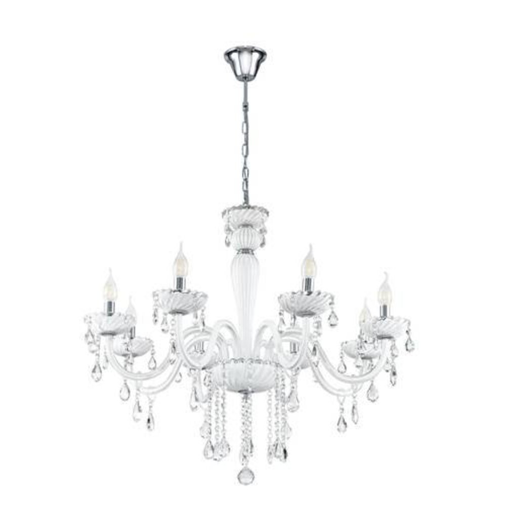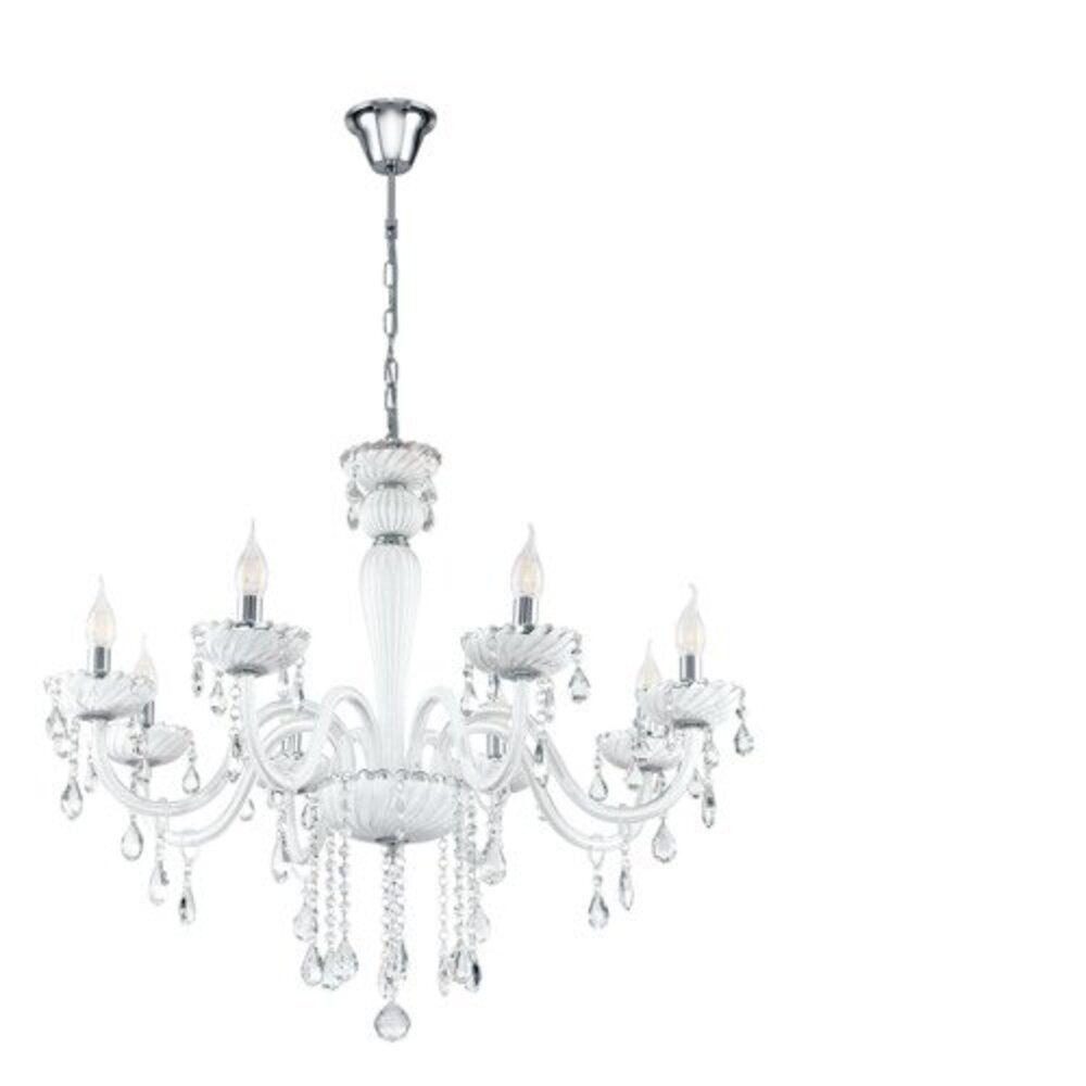Ez a CARPENTO sorozatú függesztett lámpa krómozott acélból és fehér üvegből készült. A reflektorhoz nyolc E14-es izzóra van szükség.