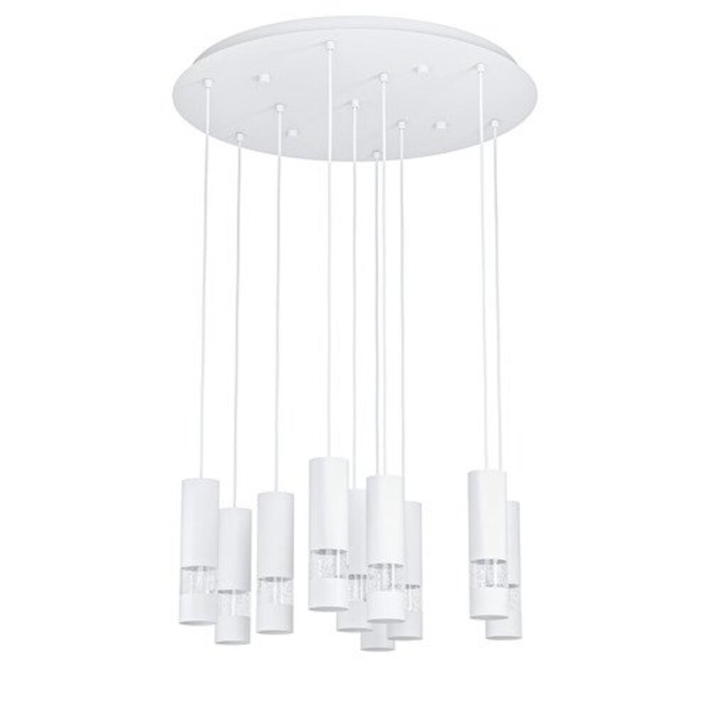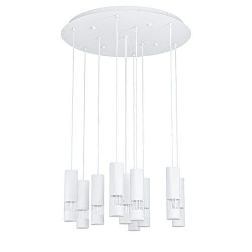 A BERNABETA LED függeszték tíz henger alakú lámpatesttel és fehér fém mennyezeti rögzítéssel rendelkezik. Minden lámpatest alsó részén átlátszó műanyag elem található, amely levegőbuborékokkal díszített, így egyedi világítási hatást teremt a helyiségben. Ez a függeszték ideális választás a modern és minimalista belső terekbe, tökéletes befejezést nyújtva a nappaliban vagy az étkezőasztal felett. A termék tartalmazza a GU10 típusú izzókat, amelyek kellemes, meleg fehér fényt bocsátanak ki.