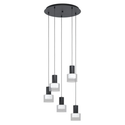 A MOLINEROS LED függeszték modern belső terekbe tervezve készült, öt kerek üveg lámpabúrát tartalmaz, melyek mindegyikét egy hengeres fekete fém elem koronáz. A lámpabúrák fekete textilkábellel és belső fehér műanyag vázzal rendelkeznek, tökéletesen kiegészítve a minimalista megjelenést. A függesztékek helikális elrendezésben lógnak a mennyezetet takaró elemből, így jól illeszkednek a modern enteriőrbe. A termék kellemes meleg fehér fényt kibocsátó GU10 LED fényforrással érkezik, ami egyedi világítást biztosít bármely helyiség számára, legyen az a nappali vagy az étkező asztala felett. A fényforrás tartozék a termékhez.