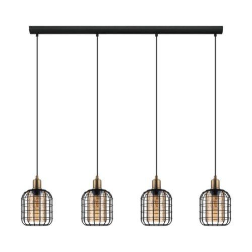 A CHISLE függeszték lámpa négy fekete drót árnyékolóval rendelkezik, amelyeket borostyán bevonatú üveg belső árnyékolók díszítenek. A lámpa feketére festett fém takaróról lóg, és amikor felkapcsolják, a keretes kialakítás lenyűgöző fény- és árnyékjátékot hoz létre a drótvázon. Az elegáns üveg és rusztikus fém kombinációja tökéletesen illeszkedik a modern loft stílusú belső terekbe. A termék figyelemfelkeltő világítást biztosít bármely helyiségben, legyen szó a nappaliról vagy egy hosszú étkezőasztal fölötti megvilágításról. A lámpa 4 db E27-es fényforrást igényel, amelyek nem tartozékai a terméknek.