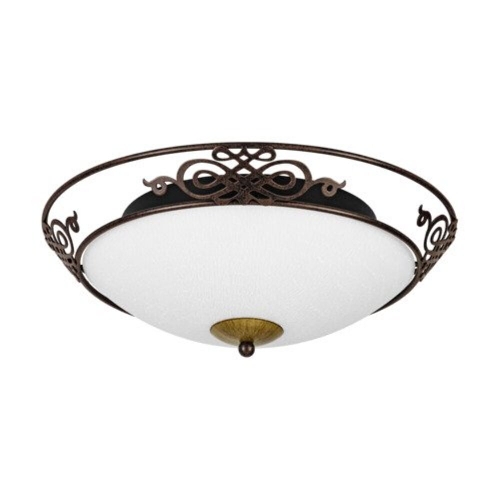 A MESTRE mennyezeti lámpának kerek üveg lámpabúraja van, melynek kréta befejezése van. A görbült antik barna fém elemek klasszikus megjelenést kölcsönöznek a mennyezeti lámpának. A design remekül illeszkedik a vidékies stílusú belső terekhez és otthonos fényhatást biztosít, legyen szó a konyháról, nappaliról, étkezőről, előszobáról vagy hálószobáról. A villanykörték nem tartoznak a termékhez. A termékhez E27 foglalatok tartoznak és E27 izzókra van szükség.