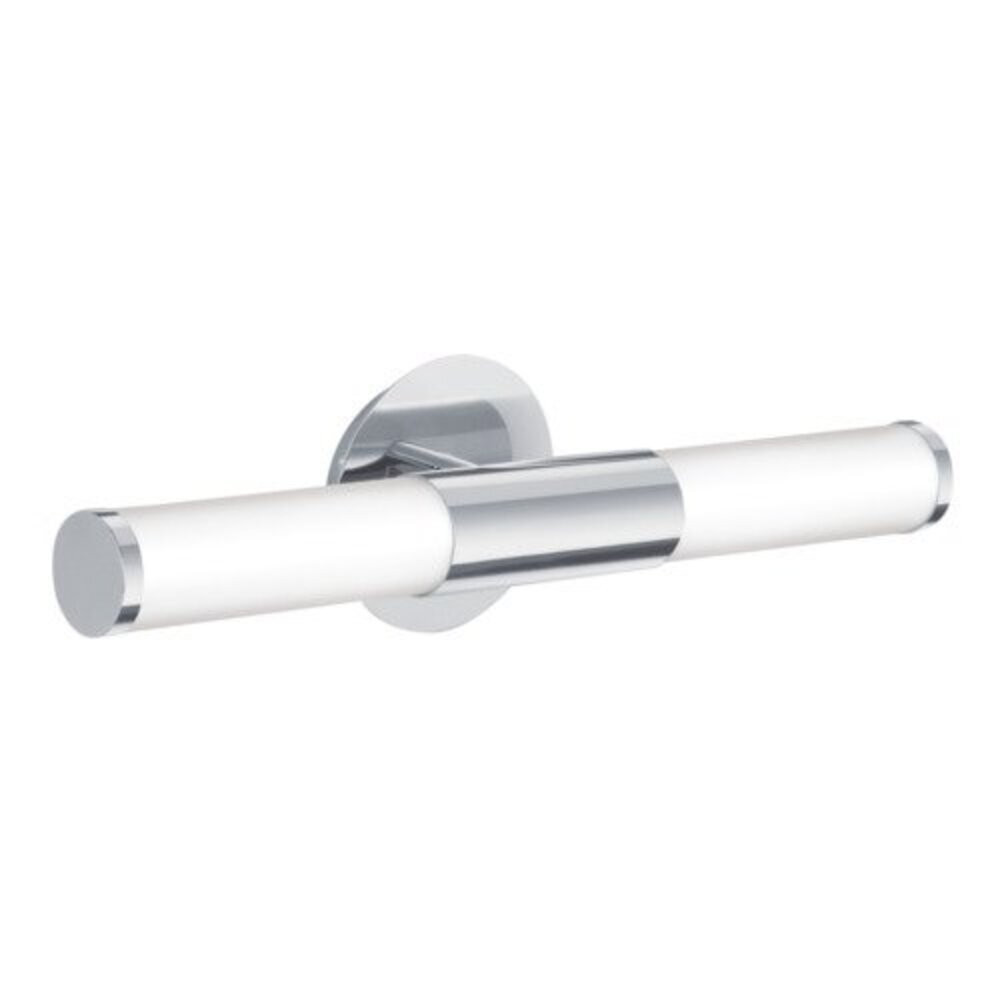 Ez a PALMERA sorozatú fürdőszobai fali lámpatest krómozott acélból és fehér, opál-matt üvegből készült. IP44-es védőbesorolással rendelkezik és két E14-es izzóra van szüksége a fényléshez.