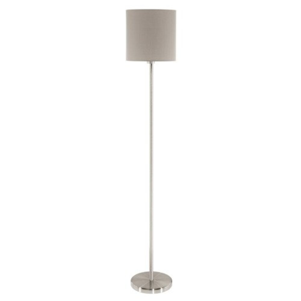 A PASTERI állólámpa matt nikkel fém alappal rendelkezik, kerek textil lámpabúrával, ami taupe színű. A termék egyszerű kialakítása miatt szinte bármilyen belsőépítészeti trenddel harmonikusan illeszkedik. Az állólámpa könnyedén kapcsolható be és ki egy padlókapcsolóval. Akár a hálószobában, a nappaliban vagy az előszobában, a termék hangulatos világítást biztosít a lakótérben. A villanykörte nincs a csomagban. A terméknek E27-es foglalata van, így E27 körte szükséges hozzá.