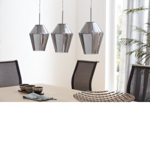 A MURMILLO függőlámpa három kúp alakú, füstölt fekete üveg lámpabúrából áll, amelyek hosszúkás, króm színű fém baldachinnal vannak rögzítve. A függőlámpa a modern és minimalista belső terek tökéletes befejező érintése, otthonos világítást teremtve a helyiségben, legyen az a nappaliban vagy a hosszú étkezőasztal felett. A villanykörték nincsenek tartozékban. A termék E27-es foglalatokkal rendelkezik és E27-es villanykörtéket igényel.