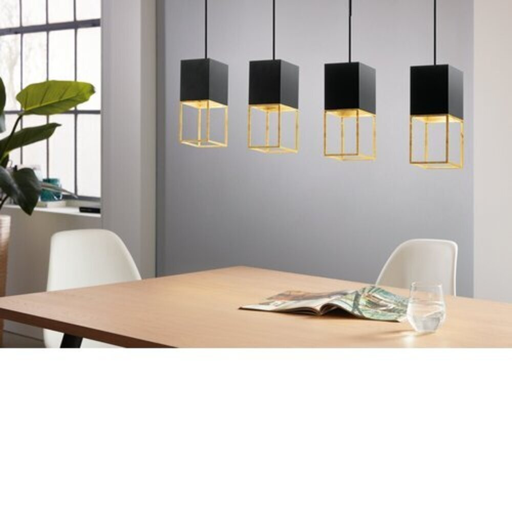 A MONTEBALDO lógólámpa hosszú, fekete fém tartóval rendelkezik, amely négy kocka alakú fejjel van párosítva. A fejekhez csatolt aranyszínű fém keretek kiegészítik a lógólámpa stílusos megjelenését. A lámpatartók a design belsejében találhatók, így a mellékelt GU10 izzók rejtve vannak és kellemes, meleg fehér fényt vetnek az alattuk lévő területre. A minimalista lámpa tökéletesen beilleszkedik a modern belső terekbe, ideális világítási megoldást kínálva a nappaliban vagy az étkezőasztal felett.