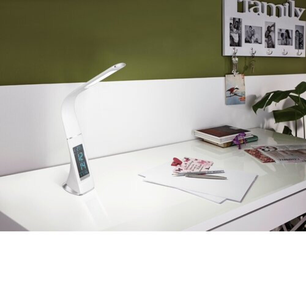 A COGNOLI LED asztali lámpa fehér műanyagból készült króm részletekkel. Az integrált LED-ek semleges fehér fényt bocsátanak ki, ami ideális az asztalnál végzett munkához. A rugalmas nyak pillanatok alatt fókuszált megvilágítást biztosíthat munkahelyének, és háromlépéses érintődimmerrel rendelkezik. A termék kijelzi az időt, a hőmérsékletet, a dátumot, és rendelkezik hasznos ébresztő funkciókkal különböző hangokkal. Modern megjelenésével és vonzó műanyag részleteivel ez a lámpa biztosan praktikus, mégis dekoratív must-have elem lesz munkahelyén, legyen az irodája asztalán vagy otthoni irodájában.