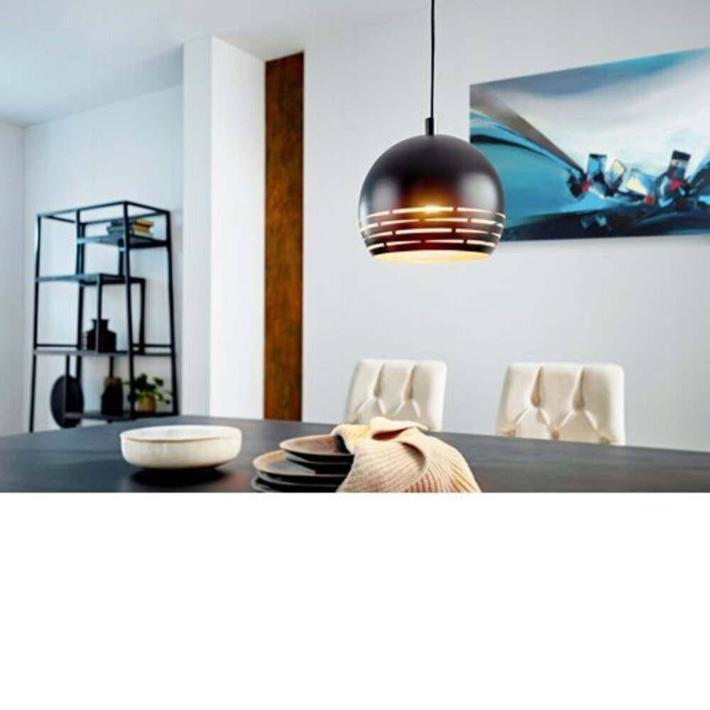 A CAMASTRA függesztett lámpa kerek, fekete színű fém lámpaernyővel rendelkezik, melynek alsó részében kivágások találhatóak, és belül aranyszínű bevonattal rendelkezik. A vízszintes kivágások lenyűgöző fény- és árnyékjátékot hoznak létre, amint a lámpa bekapcsol. A függesztett lámpa zökkenőmentesen illeszkedik a modern belső terekbe, különleges megvilágítást biztosítva bármilyen helyiség számára, legyen az a nappali vagy az étkező. A képen látható filament izzólámpa nincs a csomagban. A terméknek E27-es lámpafoglalata van és 1 db E27-es izzólámpát igényel.