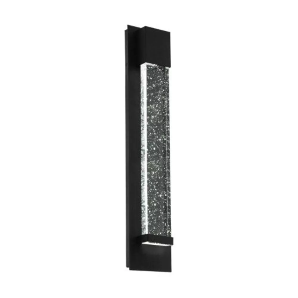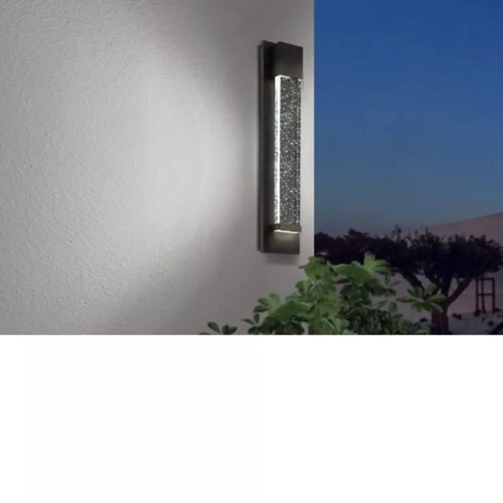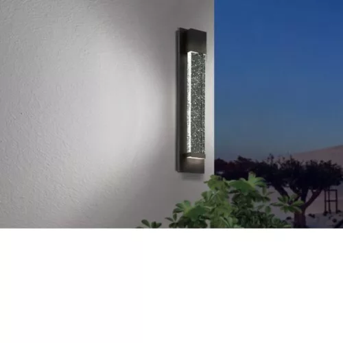 A VILLAGRAZIA kültéri LED fali lámpa hosszú fekete alumínium testtel és átlátszó, levegőbuborékos üveg világítópanellel rendelkezik. Az üvegpanelen található légbuborékok különleges fényjátékot idéznek elő a környező területen. Az integrált LED-ek kellemes meleg fehér fényt bocsátanak ki, és az IP44 védettségnek köszönhetően a lámpa kültéri használatra is alkalmas. Modern dizájnja bármilyen kültéri környezetbe jól illeszkedik. A fényforrás tartozék a termékhez.
