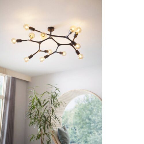 A BOCADELLA 1 mennyezeti lámpa tizenkét ágazattal rendelkezik, melyek fekete fémből készültek. A mennyezeti lámpa kiegészíti a modern belső tereket és jellegzetes világítási megoldást nyújt bármilyen helyiség számára, legyen az konyha, nappali, hálószoba, előszoba vagy étkező. A termék 12 x E27 izzót igényel, amelyek nincsenek benne.