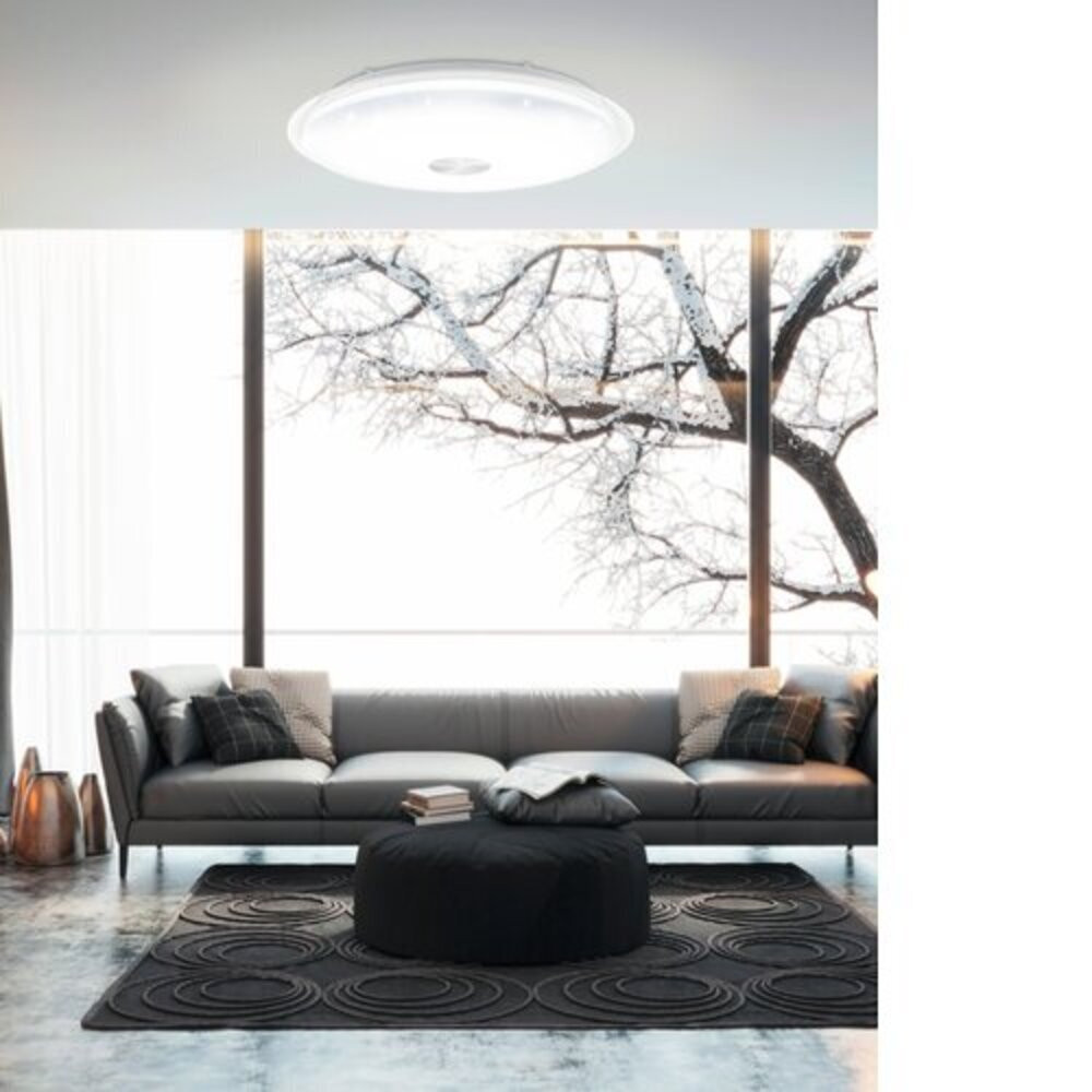 A LANCIANO 1 LED mennyezeti lámpa fehér műanyagból készül, és kerek LED borítása van kristályhatású felülettel. Bekapcsolt állapotban csillogó megjelenést teremt. A termék áttetsző műanyag gyűrűvel, és dekoratív krómszínű részletekkel rendelkezik a design közepén. Az integrált LED-ek kellemes fényt adnak, amely szükség szerint állítható. Az included távirányító szabályozhatja a fényerősséget, változtathat a színhőmérsékleten meleg fehér, semleges fehér és hűvös fehér között, és beállíthatja az éjszakai fényt és az időzítőt. 56 cm átmérővel a mennyezeti lámpa tökéletesen illeszkedik a modern belső terekhez, különleges világítást biztosítva bármilyen helyiséghez, legyen az a konyha, nappali, hálószoba, gyermekszoba vagy előszoba.