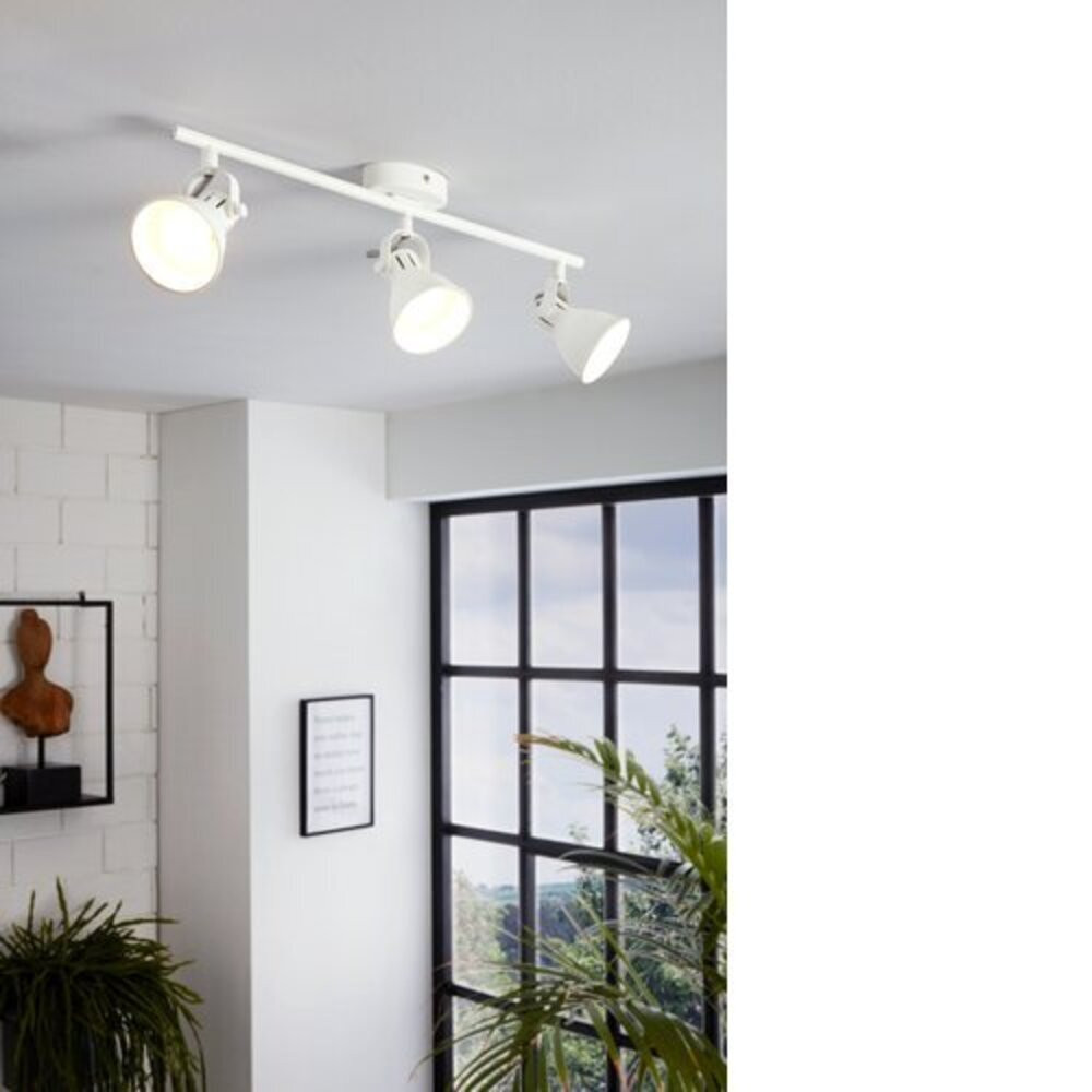 A SERAS 1 LED mennyezeti lámpa fehér fém rögzítéssel és három állítható fehér fém reflektorral rendelkezik. A mennyezeti reflektor trendi megjelenése tökéletesen kiegészíti a modern belső tereket és a konyha, nappali, hálószoba, előszoba vagy étkezőben koncentrált megvilágítást biztosít. A termék tartalmazza a képen látható GU10-es fényforrást, amely kellemes meleg fehér fényt biztosít.