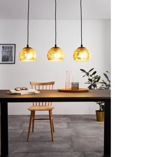 Az ALBARACCIN függőlámpa három gömb alakú üveg árnyékolót tartalmaz aranyleveles stílusú befejezéssel. A három üvegárnyékoló fekete textilkábelekkel lóg egy hosszúkás fekete fémtetőn. Az elegáns függőlámpa egyszerű tervezéssel rendelkezik, és kiválóan kiegészíti a modern belső tereket, biztosítva a stílusos világítást a nappaliban vagy a étkezőben az étkezőasztal felett. A villanykörték nincsenek tartozékban. A termék E27-es foglalattal rendelkezik, és 3 db E27-es izzót igényel.