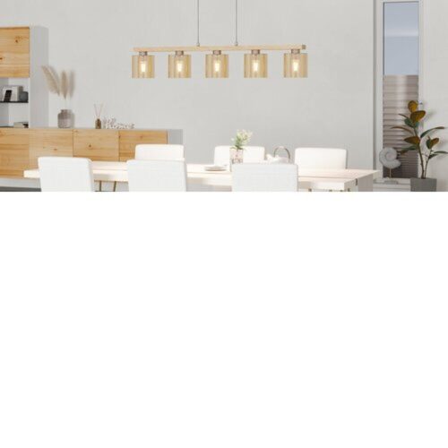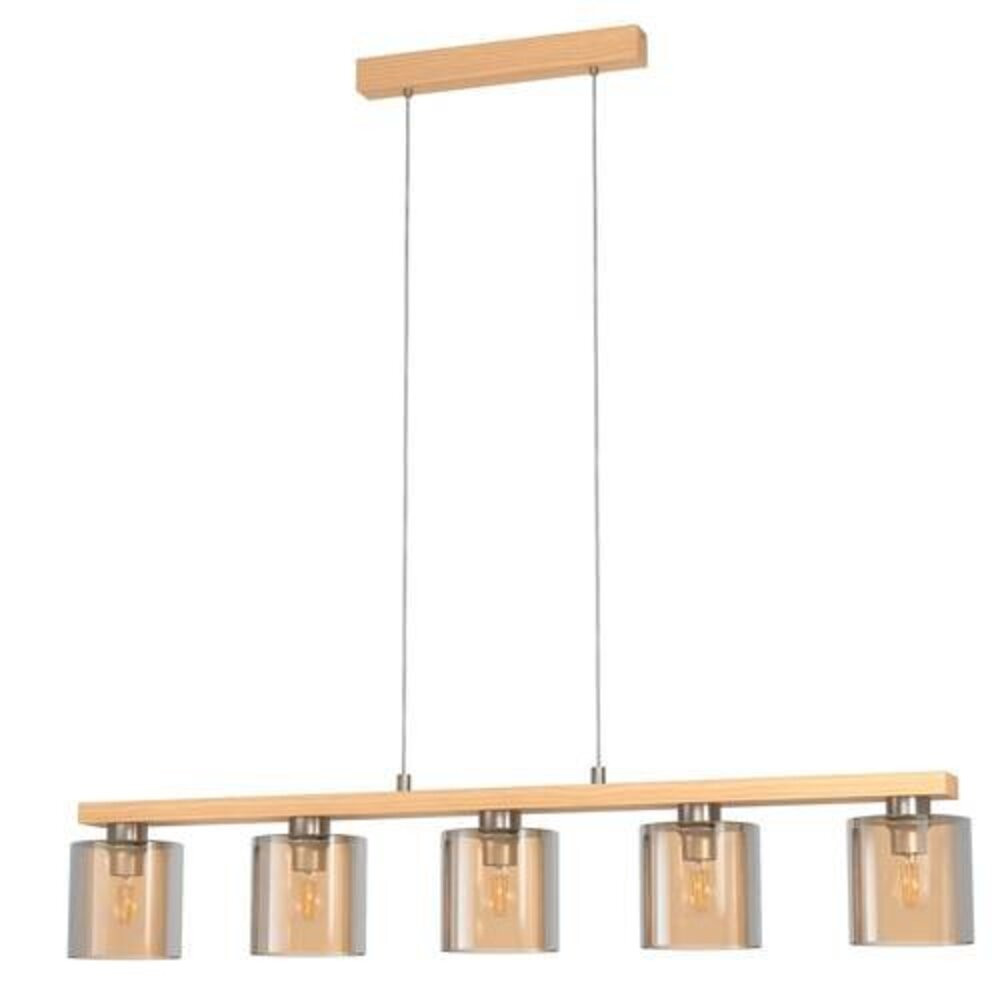 A CASTRALVO függeszkedő lámpa természetes fából készült rudat és öt, matt nikkel részletekkel díszített, borostyán színű üveglámpabúrákat tartalmaz. A függesztő lámpa baldachinja is természetes fából készült, így biztosítva, hogy tökéletesen illeszkedjen a modern enteriőrbe. Kellemes világítást biztosít a nappaliban vagy a hosszú étkezőasztal felett. A képen látható filament izzók nem tartoznak a termékhez. A termék 5 x E27 izzót igényel, amelyek nem tartoznak a csomaghoz.
