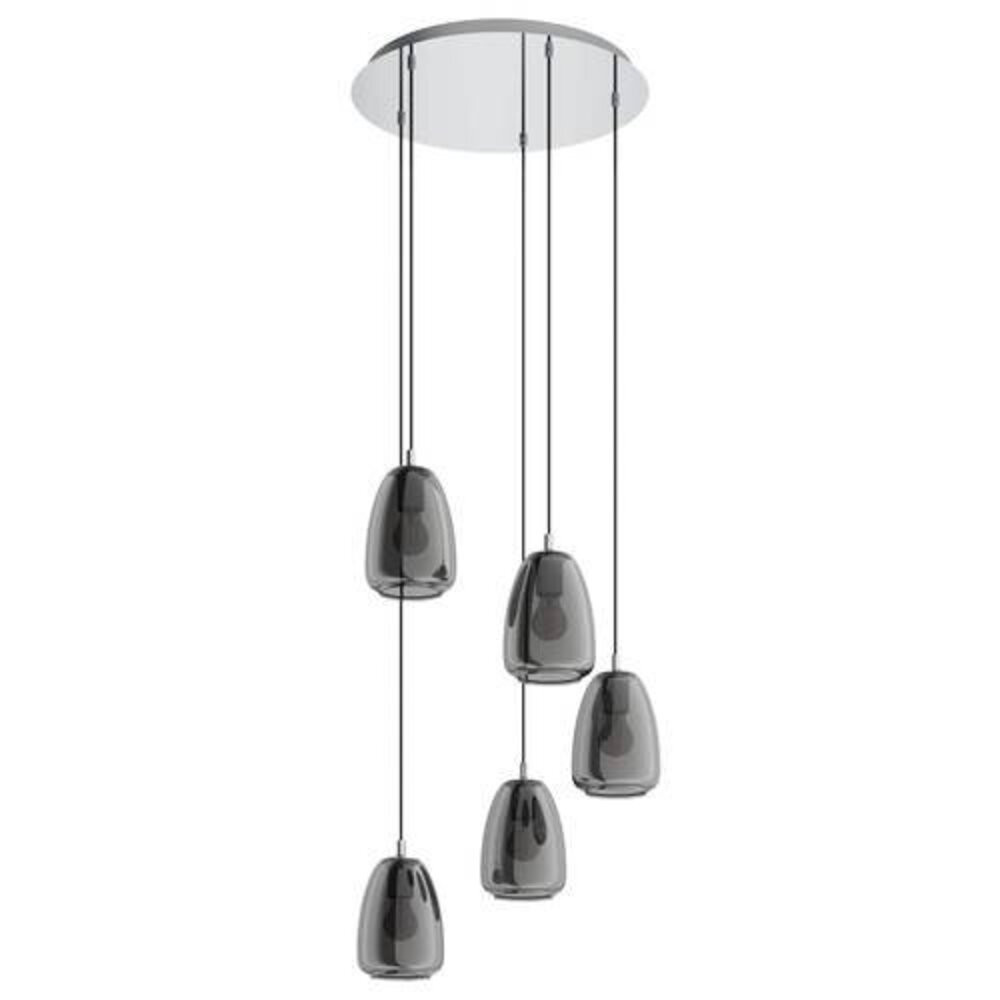 Az ALOBRASE függesztett lámpa öt kerek, füstös fekete üvegbúrával rendelkezik. A búrákat fekete kábelek tartják egy króm színű, fém kör alakú csarnoktól. A lámpák spirális elrendezésben lógnak, különösen jól kiegészítve a modern belső tereket, és stílusos világítást biztosítva bármilyen tér számára, legyen az a nappali vagy az étkezőasztal felett az étkezőben. A képen látható filament izzók nem tartoznak a termékhez. A termékben E27 foglalatok találhatók, és E27-es izzókra van szüksége.