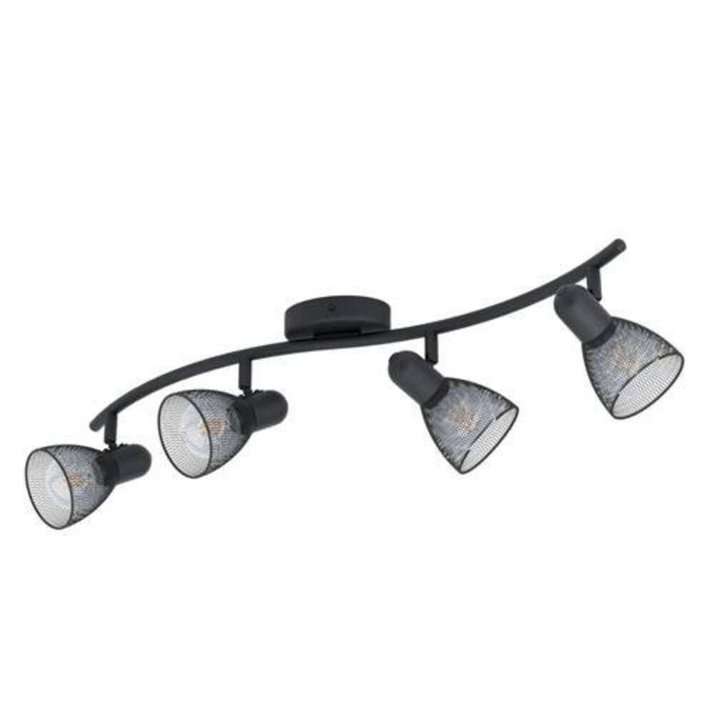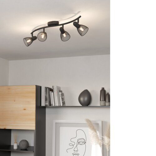 A CAROVIGNO mennyezeti lámpa fekete fémből készül és négy állítható kerek fényszóróval rendelkezik, amelyek huzalból készültek. A lámpaernyők az enyhén ívelt karra vannak rögzítve, és hálószerű huzalrácsozatot alkotnak, amely varázslatos fény-árnyék játékot hoz létre, amint a fény bekapcsol. A mennyezeti spotlámpa tökéletes befejező érintés a modern belső terekhez. Az állítható fejek lehetővé teszik a területek kiemelését, legyen az a konyhában, nappaliban, hálószobában, előszobában vagy étkezőben. A képen látható filament izzók nem tartoznak a termékhez. A termék E14-es foglalattal rendelkezik, és E14-es izzókat igényel.