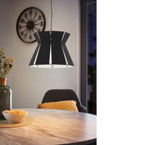 A VALECROSIA függőlámpa lámpaernyője nyolc fekete fémlemezzel rendelkezik, fehér belső felületekkel. A termék kivágott kialakítású a fém lámpaernyőjén, amely egyedi megjelenést kölcsönöz a függőlámpának és izgalmas fény- és árnyékjátékot hoz létre a falon. A függőlámpa jól kiegészíti a modern belső tereket és jól működik bármely helyiségben, legyen az a nappaliban vagy az étkezőasztal felett az étkezőben. A villanykörtét nem tartalmazza. A terméknek E27 lámpatartója van, és E27 villanykörtét igényel.