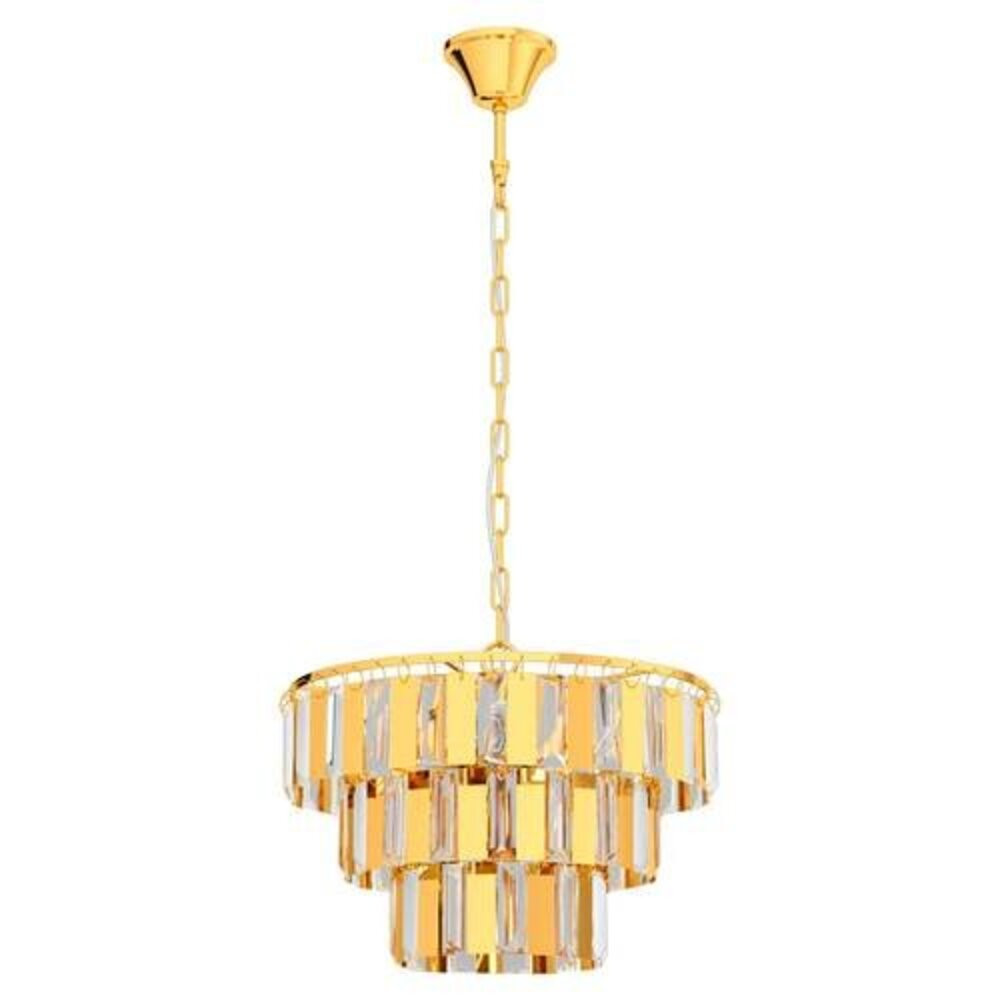 Az ERSEKA mennyezeti lámpa váltakozó sorokban tartalmaz tiszta kristályokat és rézszínű fémlemezeket. A prémium kristályelemek ragyogó, magas minőségű megjelenést kölcsönöznek, amikor a fény be van kapcsolva. A függő lámpa elegánsan illeszkedik a modern belső terekhez, és bármilyen helyiségben, legyen az a nappali vagy a étkezőasztal felett, megteremti a megfelelő hangulatot. A termék E14-es foglalatokkal rendelkezik és 5 db E14-es izzót igényel.
