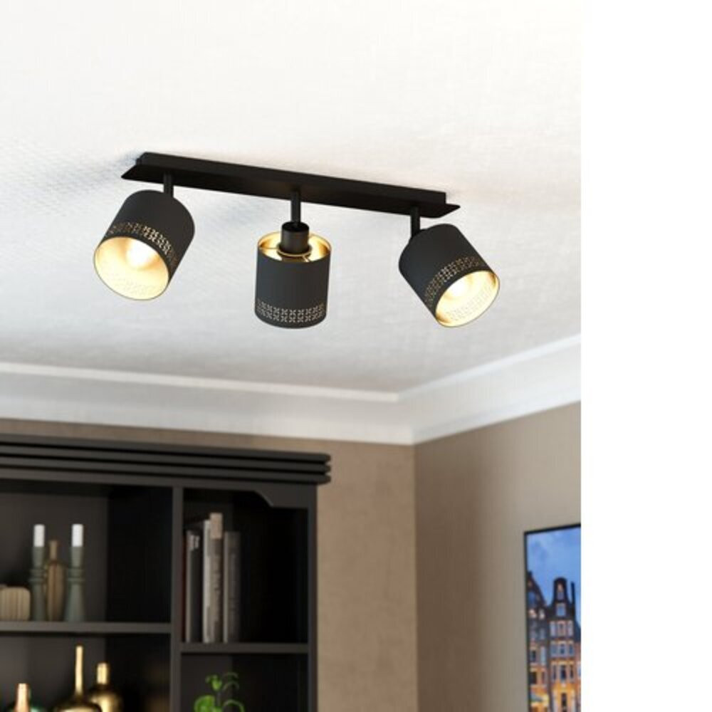 Az ESTEPERRA mennyezeti lámpa fekete fémből készült, és három állítható reflektorral rendelkezik, amelyeket fekete szövettel borítottak, belül arany béléssel. A lámpabúrán lévő finom kivágások fény- és árnyékjátékot hoznak létre, amint bekapcsolják a lámpát. Forgatható fejeivel a mennyezeti Spotlámpa majdnem minden otthonban megállja a helyét, és jól működik bármilyen helyiségben, legyen az a nappali, a hálószoba, az előszoba vagy az étkező. A termékhez 3 db E27-es izzó szükséges, amelyek nincsenek tartozékban.