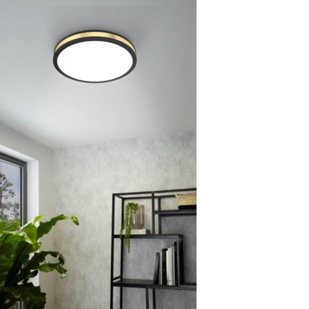 A 'PESCAITO' LED mennyezeti lámpa fekete fémből készült, arany színű műanyag részlettel. Az integrált LED-eket fehér műanyag borítás takarja, és kellemes, meleg fehér fényt biztosítanak. A mennyezeti lámpa tökéletesen illeszkedik a trendi belső stílushoz, elegáns világítást nyújt bármilyen helyen, legyen szó a nappaliról, hálószobáról, előszobáról vagy az étkezőről.