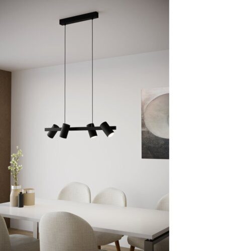 A GATUELA 1 LED függőlámpa fekete fémből készült, négy állítható fényfejjel, amelyek mindkét oldalon helyezkednek el. Monokróm dizájnjával a lámpa tökéletesen illeszkedik a modern belső terekhez, jellegzetes világítást biztosítva bármely helyiségben, legyen az a nappali vagy egy hosszú étkezőasztal felett. A termék 4 db E14-es izzót igényel, amelyek nem tartozékai a csomagnak.