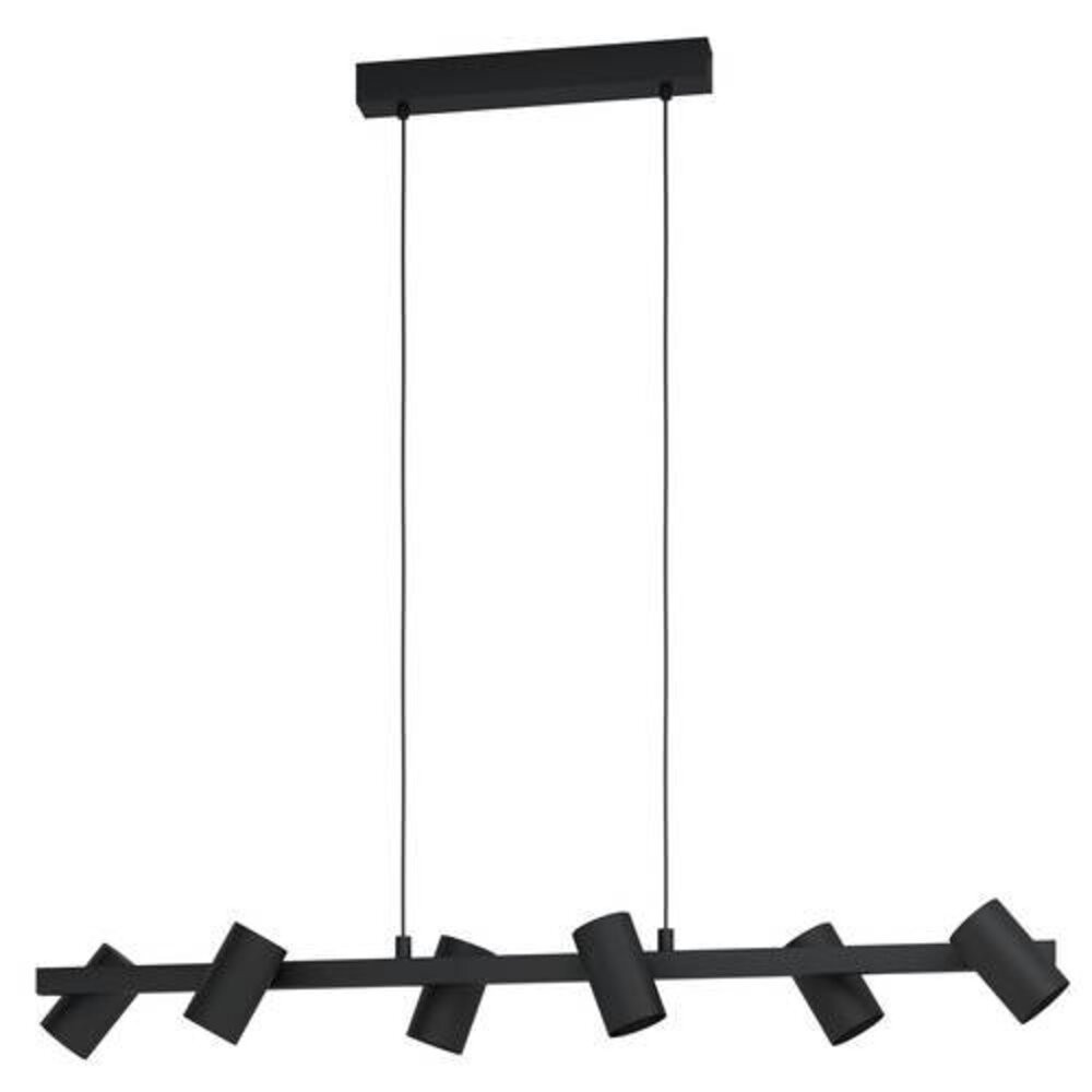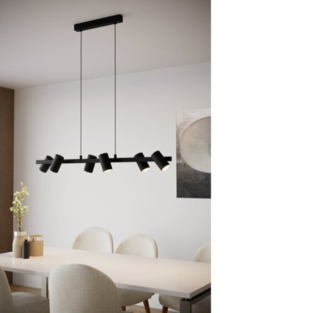 A GATUELA 1 LED függőlámpa fekete fémből készült, és hat állítható fényforrással rendelkezik, amelyek a lámpa mindkét oldalán helyezkednek el. Monokróm dizájnjával tökéletesen illeszkedik a modern belső terekhez. A termék figyelemfelkeltő eleme lesz bármely helyiségnek, legyen szó a nappaliról vagy az étkezőasztal fölött elhelyezett lámpáról. A lámpához 6 darab E14-es fényforrás szükséges, amely nem tartozék.
