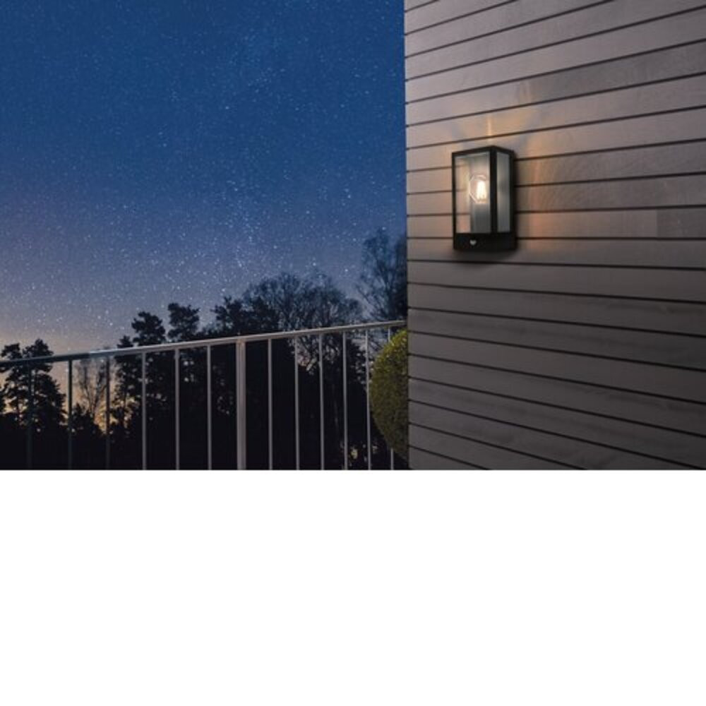 Az ALAMONTE kültéri fali lámpa modern dizájnja fekete fémvázzal és átlátszó üveg panelek alkalmazásával készült, így a lámpa izzója jól láthatóvá válik. A készülék beépített mozgásérzékelővel rendelkezik, amely automatikusan bekapcsolja a világítást, így megvilágítja a bejáratot és távol tartja a nem kívánt látogatókat. Az integrált szürkületi érzékelő figyeli a környezeti fény szintet, csak akkor kapcsol be, amikor arra szükség van. Az IP44 védettségnek köszönhetően a lámpa ellenáll a fröccsenő víznek, így ideális választás a kültéri használatra, modernes küllemével pedig tökéletes kiegészítője lehet a modern kültéri területeknek. A termék 1 db E27 típusú fényforrást igényel, amely nem tartozék a csomaghoz.