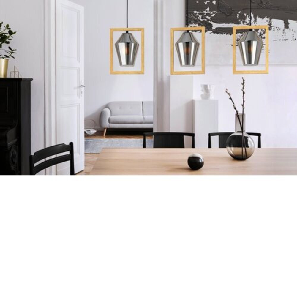 A VIGLIONI függeszték lámpa három árnyékkal rendelkezik, amelyek mázott fekete üvegből készültek, mindegyik egy fa tölgy furnér keret által övezve. A termék fekete fém mennyezeti rögzítővel és fekete textílkábellel van ellátva. Különleges dizájnjával ez a függeszték lámpa tökéletes kiegészítője a modern belső tereknek, különleges világítási megoldást nyújtva a nappaliban vagy az étkező asztala felett. A fényforrások nem tartozékai a terméknek, E27 foglalatú izzókat igényel. Max. teljesítmény: 3x40W.