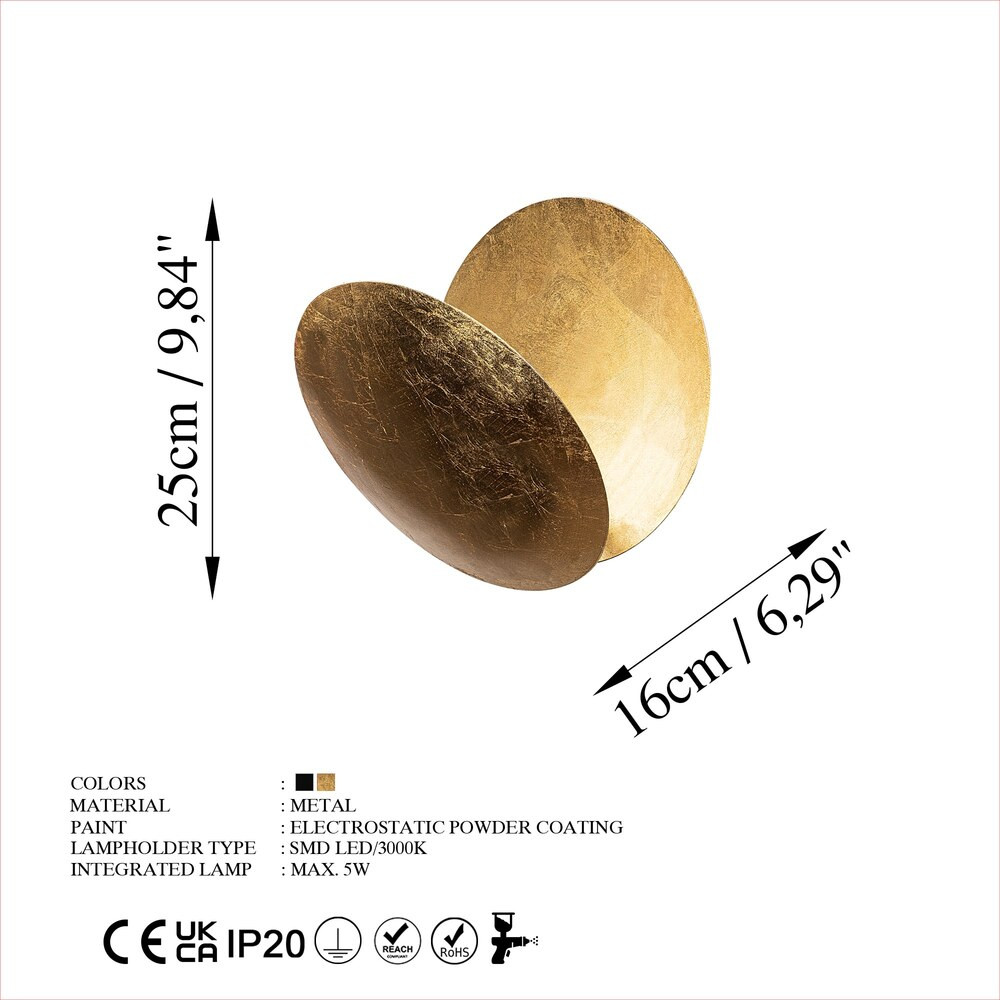 Elegáns arany fali lámpa, fém ház, 25 x 25 x 16 cm | SMD LED 5W 3000K | Stílusos világítás a modern lakberendezéshez, IP20 besorolású, tökéletes nappali, hálószoba és folyosó hangulatához