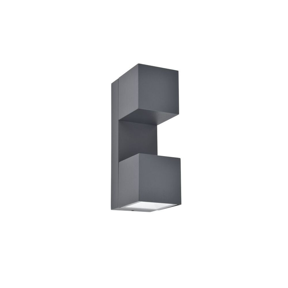 A sötétszürke színű FARI kültéri LED fali lámpa két mozgatható lámpafejjel rendelkezik a rugalmas megvilágítás érdekében, és vízszintes vagy függőleges felszerelést tesz lehetővé, praktikus alkalmazkodóképességet kínálva a különböző kültéri környezetekhez.