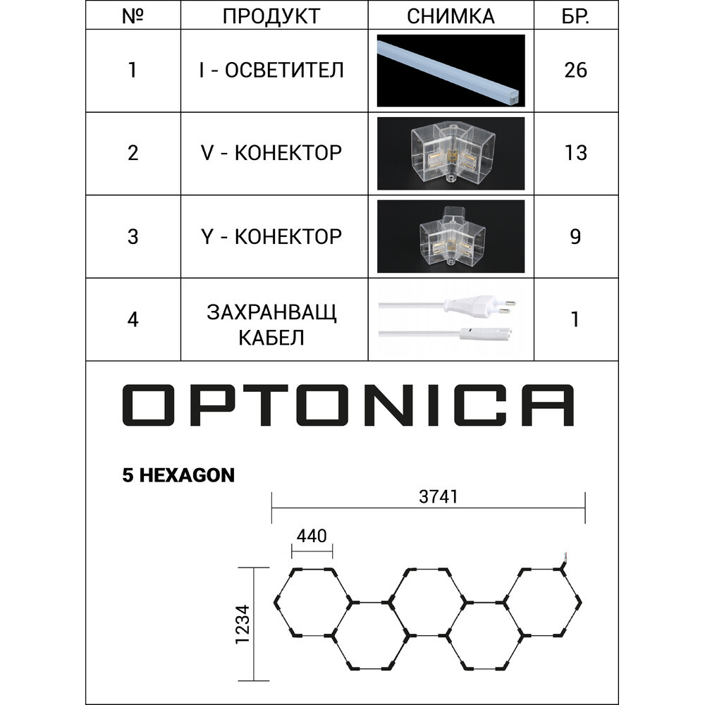 Optonica Hexagon 5 darabos lámpaszett professzionális, nagy fényerejű világításhoz. A szett 203 W névleges teljesítmény mellett 24 360 lm összfényáramot biztosít, színhőmérséklete 6000 K (hideg fehér), a burkolat fehér kivitelű. A csomag tartalmazza a telepítéshez szükséges kiegészítőket, amelyek egyszerűsítik a felszerelést és lehetővé teszik a rugalmas telepítési megoldásokat (függesztett vagy felületi rögzítés). Erős, egyenletes megvilágítást nyújt ipari és kereskedelmi terekben, raktárakban, műhelyekben, kiállítótereken és kültéri, fedett területeken, ahol nagy teljesítményű hideg fehér fényre van szükség. Alacsony karbantartási igény, hatékony megvilágítás nagy területek lefedésére; ideális választás, ha intenzív, pontosan irányított világítást keres többfunkciós alkalmazásokhoz.