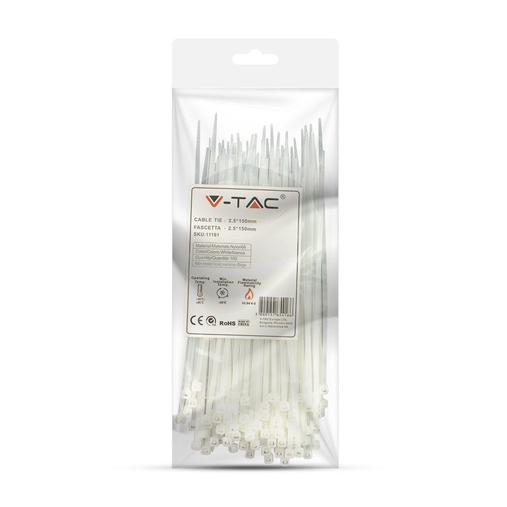 Műanyag kábelkötegelő, fehér, 100 db/csomag, V-TAC, 11161