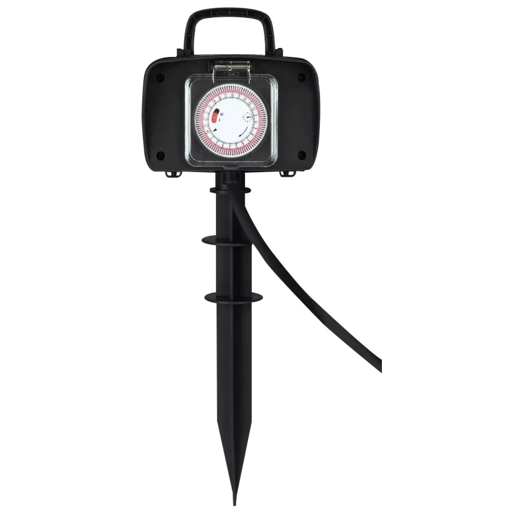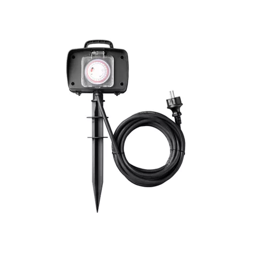 Ez a kültéri elosztó integrált időzítővel egyszerűvé teszi a kerti világítás, öntözőrendszer és egyéb kültéri elektromos berendezések automatikus vezérlését. Masszív, időjárásálló házzal és védőfedéllel rendelkezik, így védett a fröccsenő vízzel és a külső szennyeződésekkel szemben (IP44), miközben két földelt német aljzaton keresztül biztosítja a megbízható csatlakozást.