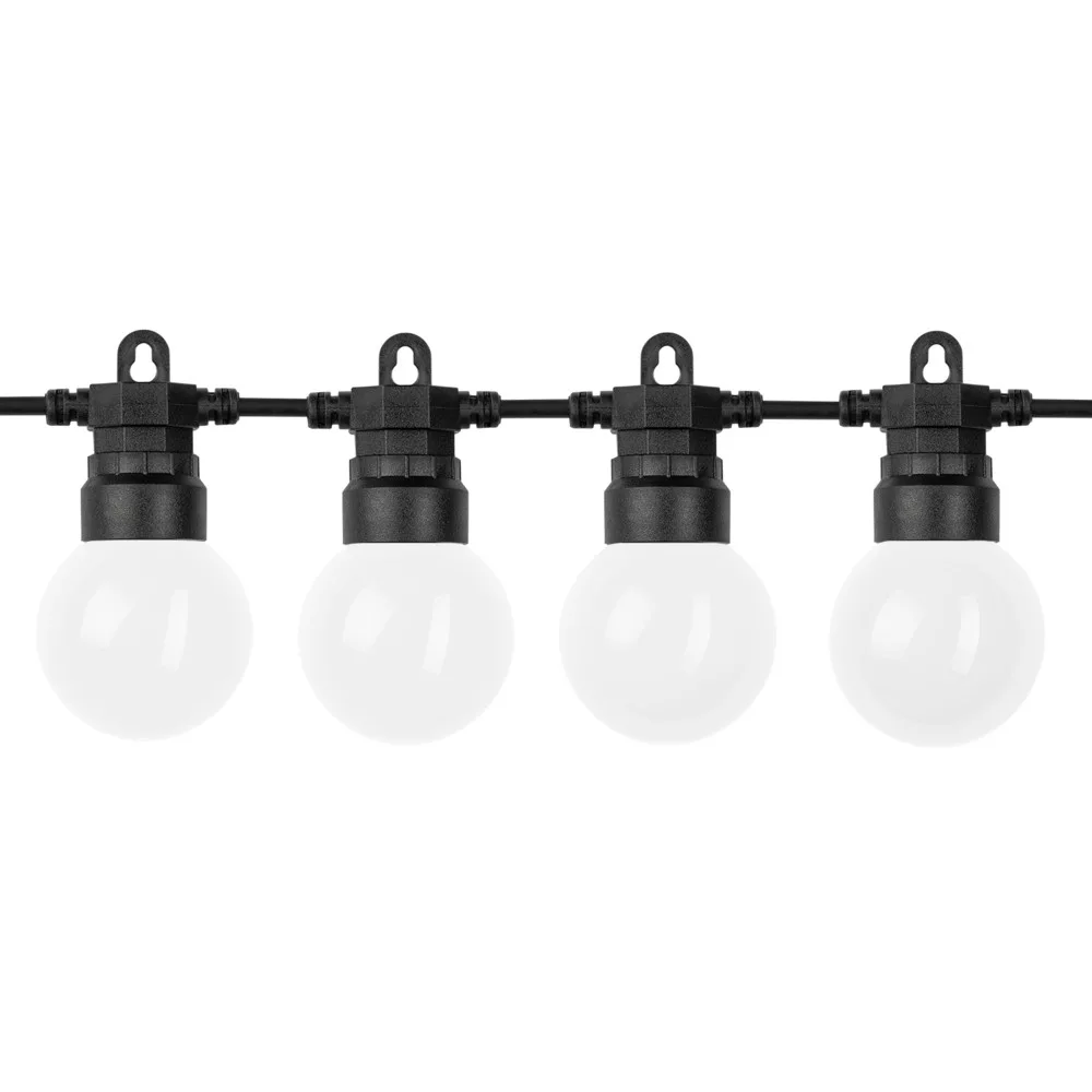 Kültéri napelemes fényfüzér tejfehér gömbökkel, stílusos és energiabarát megoldás hangulatvilágításhoz. Integrált napelemmel működő LED-ek nappal töltődnek, sötétedéskor automatikusan világítanak; a tejfehér gömbburák diffúz, meleg fényt biztosítanak (2800 K), barátságos, meghitt hangulatot teremtve. IP65-ös védelemmel rendelkezik, így esőben és kültéri körülmények között is használható. Könnyű telepítés, kábelezés nélkül, ideális teraszra, kertbe, erkélyre vagy szabadtéri rendezvényekhez.