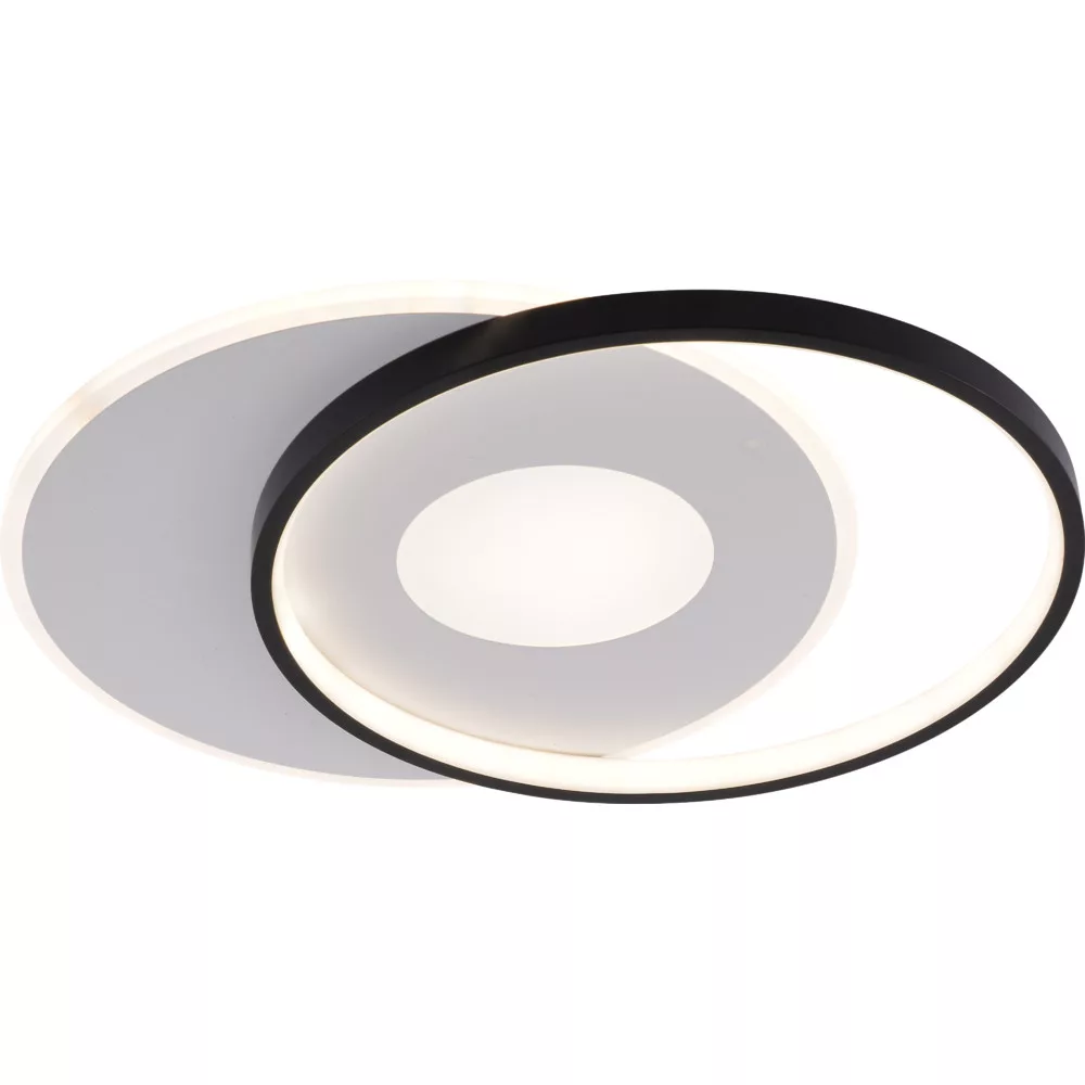 Kivitel és telepítés: elegáns fehér test fekete részletekkel, modern belső terekhez illeszkedő, letisztult design. Mennyezetre szerelhető kivitel, egyszerű bekötés és használat. A távirányító többfunkciós vezérlést biztosít (be/ki, fényerő-szabályozás, CCT-váltás), így kényelmesen irányítható a helyiség világítása.