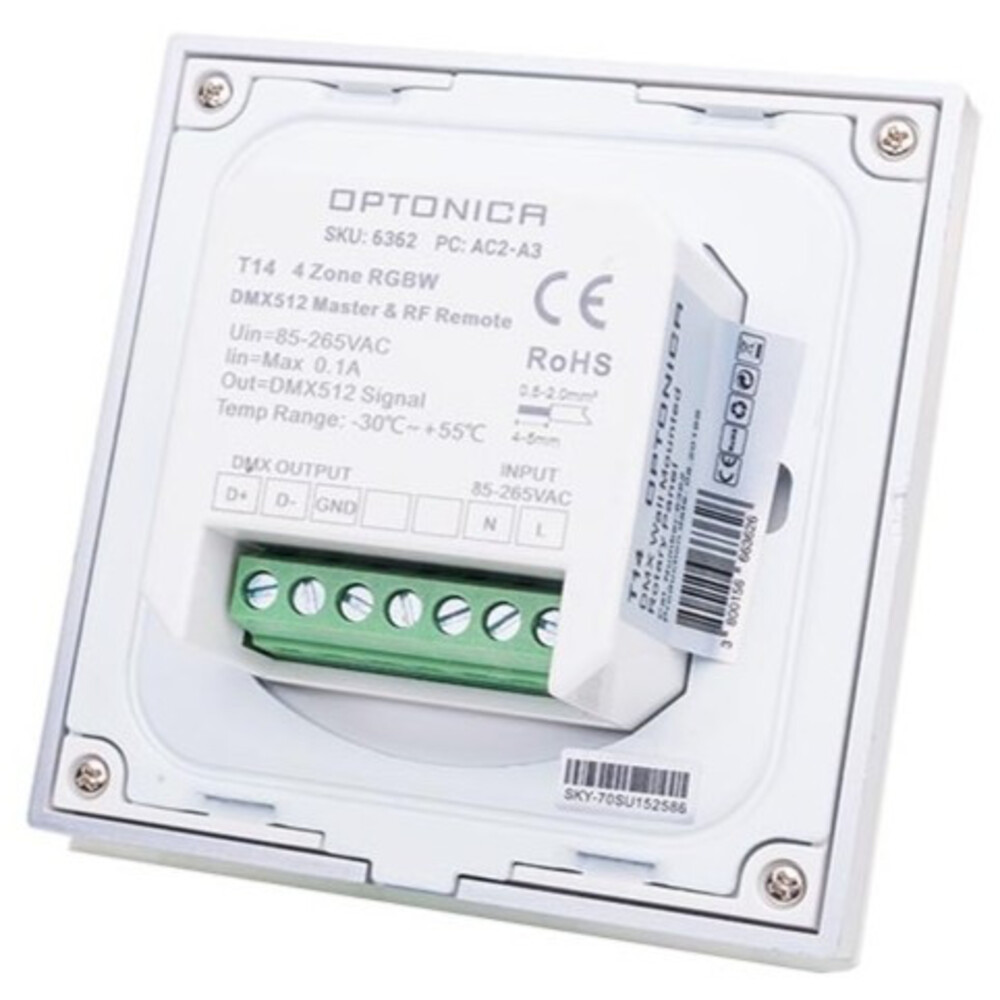 Optonica LED RGBW DMX vezérlő távirányítóval — professzionális, mégis egyszerűen kezelhető megoldás többcsatornás LED világítások vezérléséhez. Négycsatornás RGBW kimenetei lehetővé teszik a pontos színkeverést és fehér szín kezelését, míg a DMX-kompatibilitás zökkenőmentes integrációt biztosít meglévő világítási rendszerekkel. A készülék dimmelhető kimenetei finom fényerő-szabályozást és sima átmeneteket biztosítanak, így ideális hangulatvilágítási, színházi vagy rendezvényalkalmazásokhoz. A mellékelt távirányító gyors, kényelmes kézi vezérlést tesz lehetővé, emellett a vezérlő támogatja az előre beállított színeket és effektusokat, memóriafunkciót és master/slave üzemmódot a bővíthetőséghez. Esztétikus fehér háza kompakt, falra szerelhető kivitelben készült, egyszerű csatlakoztathatóságot és megbízható működést kínál beltéri LED szalagokhoz és RGBW egységekhez.