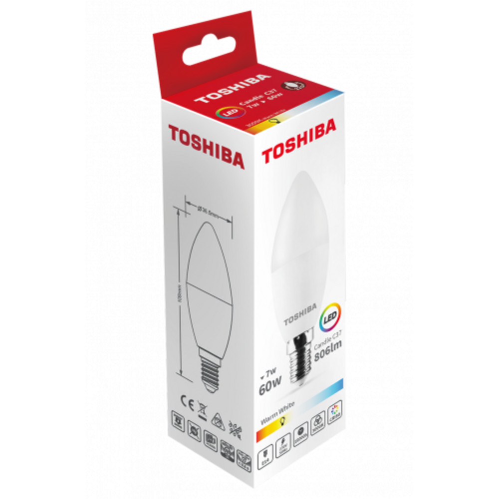 LED lámpa , égő , gyertya , E14 foglalat , 7 Watt , 220° , meleg fehér , TOSHIBA , 5 év garancia